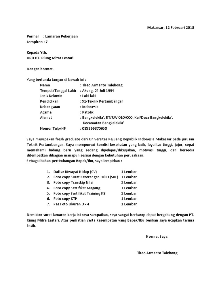 Contoh surat lamaran kerja umum, bank, karyawan, alfamart, pt, sekolahan, formal, fresh graduate, bahasa inggris, via email, tulis tangan, simple & downloadable. Berikut contoh surat lamaran pekerjaan yang bisa kamu download file dokumennya juga, link di bagian akhir artikel. Bahkan tidak hanya itu, kami juga memberikan secara detail format penulisan surat lamaran kerja. Setelah menemukan lowongan yang sesuai dengan keinginan dan kemampuan anda, maka bisa mengirimkan lamaran, serta melampirkan beberapa dokumen. Contoh surat lamaran kerja yang baik dan benar selalu menjadi solusi kamu yang ingin melamar pekerjaan disuatu perusahaan atau instansi pemerintah. Contoh surat lamaran pekerjaan yang umum. Contoh surat lamaran kerja yang baik dan benar untuk dijadikan referensi dalam usaha mencari kerja di sebuah perusahaan sesuai dengan keahlian kamu. Apalagi bila anda sudah berkeluarga dan anda adalah seorang suami. Kumpulan contoh surat lamaran kerja terbaru 2020. Tentunya, dengan berbekal pengalaman ataupun fresh graduate kita sebagai manusia akan mengharapkan sebuah. 14 contoh surat lamaran kerja di perusahaan tambang terlengkap. Contoh surat lamaran kerja ovo, vivo atau oppo dan konter hp contoh surat lamaran kerja di perusahaan tambang Contoh surat lamaran kerja bahasa inggris fresh graduate.